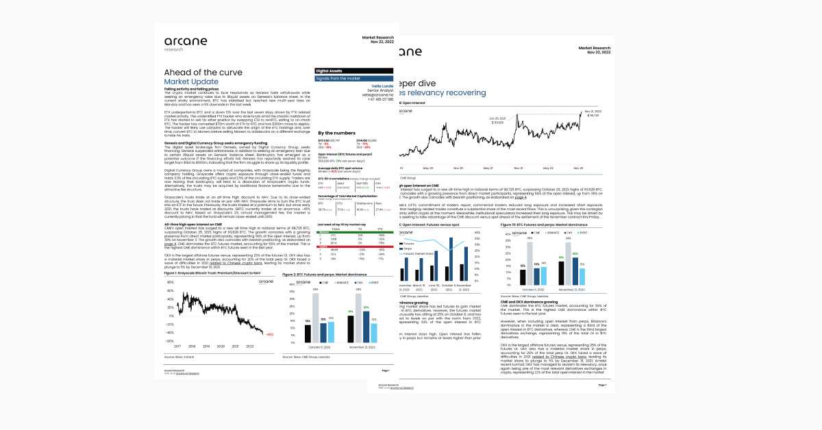 Trading volumes have fallen, and the crypto market continues to face headwinds as Genesis halts withdrawals while seeking an emergency raise. We cover the state of the market, in this fourth edition of our new market report, "Ahead of the curve". This market report will replace The Weekly Update that you normally receive on Tuesdays. The format is new, …